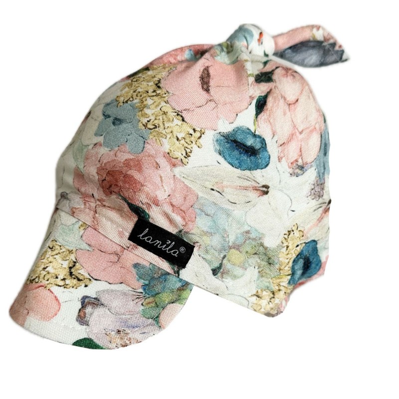 Chusta na głowę z gumką posiada wszytą wygodną gumę oraz dodatkowo jest wiązana w górnej części, dzięki czemu ma uniwersalną wielkość. Chusty z gumką występują w 2 rozmiarach, a dzięki wszytej gumie świetnie dopasowują się do głowy i pasują na dzieci od 4 miesięcy do ok. 6 lat. Daszek każdej chusty jest delikatnie usztywniany, więc w zależności od potrzeb może pozostać płaski lub można go podnieść do góry.