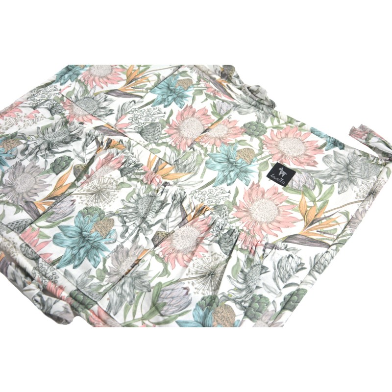 Organizery Lanila wykonane zostały z wysokogatunkowej bawełny z pięknym nadrukiem, który nie traci swojego koloru nawet po wielokrotnym praniu. W środku wypełnione zostały sprężystą gąbką, która usztywnia całość i sprawia, że przybornik nie traci swojego kształtu podczas użytkowania. W górnej oraz w dolnej części organizera znajdują się po 3 kokardy, którymi mocuje się całość do łóżeczka.
