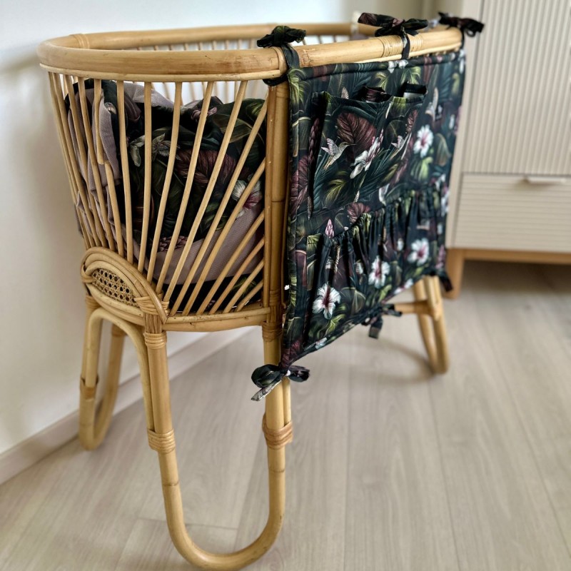 Organizery Lanila wykonane zostały z wysokogatunkowej bawełny z pięknym nadrukiem, który nie traci swojego koloru nawet po wielokrotnym praniu. W środku wypełnione zostały sprężystą gąbką, która usztywnia całość i sprawia, że przybornik nie traci swojego kształtu podczas użytkowania. W górnej oraz w dolnej części organizera znajdują się po 3 kokardy, którymi mocuje się całość do łóżeczka.