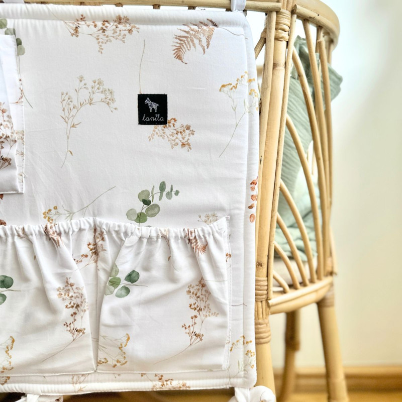 Organizery Lanila wykonane zostały z wysokogatunkowej bawełny z pięknym nadrukiem, który nie traci swojego koloru nawet po wielokrotnym praniu. W środku wypełnione zostały sprężystą gąbką, która usztywnia całość i sprawia, że przybornik nie traci swojego kształtu podczas użytkowania. W górnej oraz w dolnej części organizera znajdują się po 3 kokardy, którymi mocuje się całość do łóżeczka.