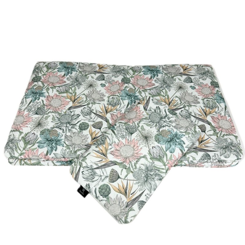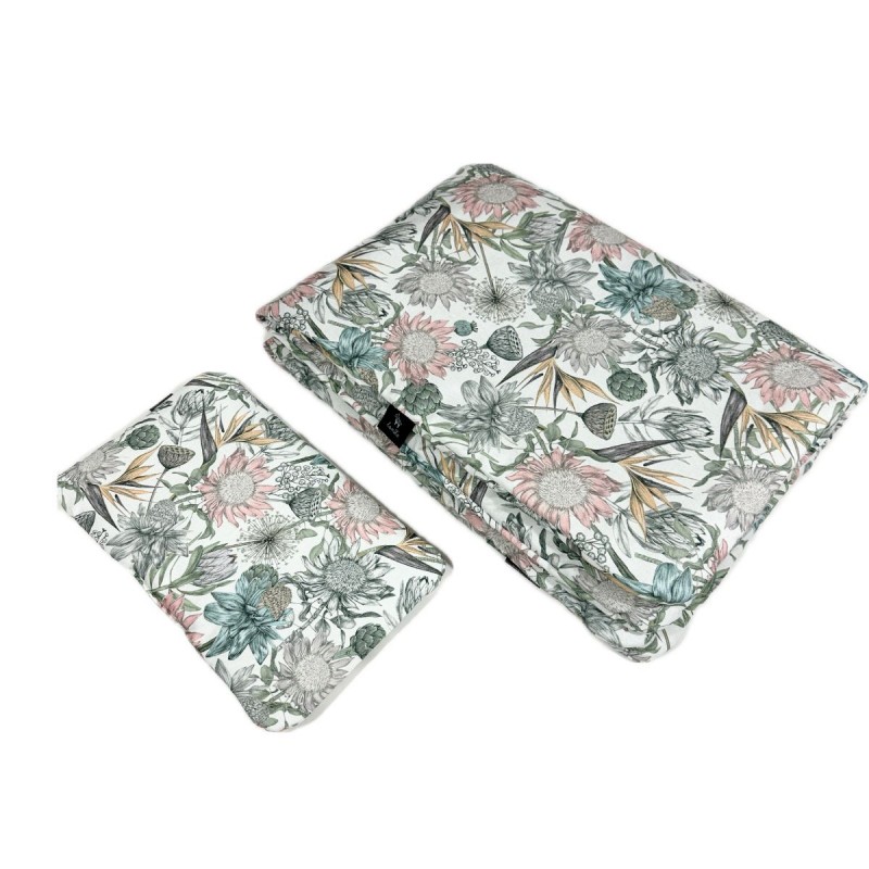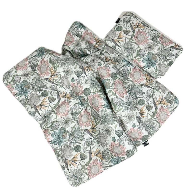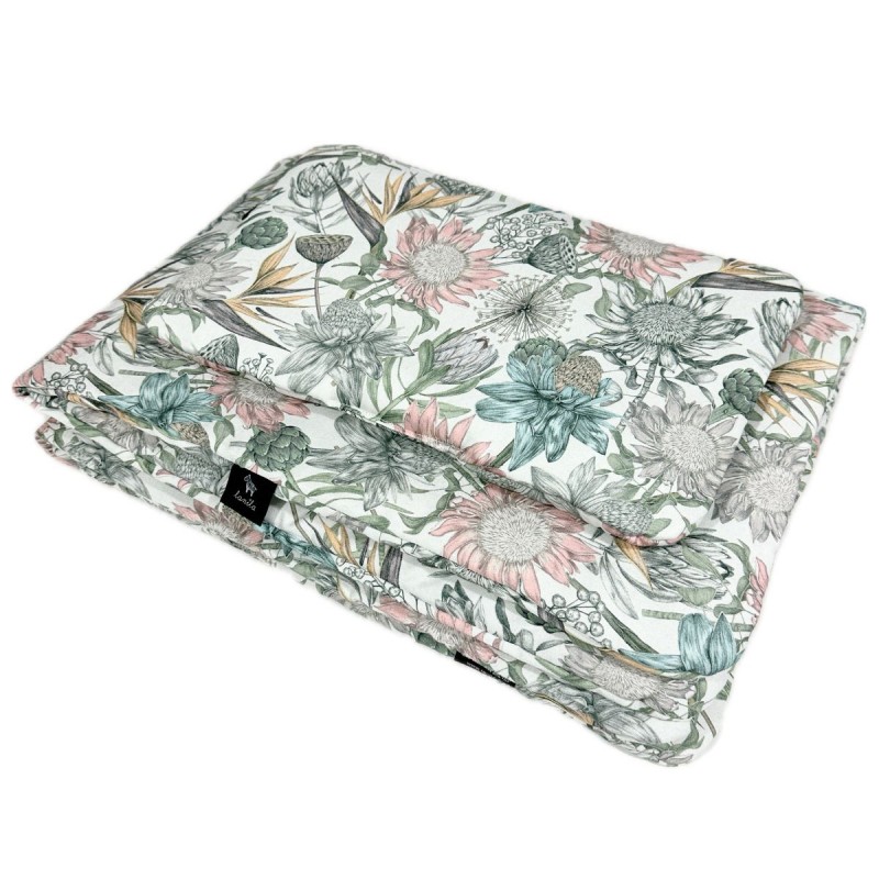 Bawełniany komplet pościeli z wypełnieniem to bezpieczna i wygodna alternatywa dla tradycyjnych poszewek. W skład kompletu wchodzi poduszka oraz kołderka z wszytym lekkim, antyalergicznym wypełnieniem.