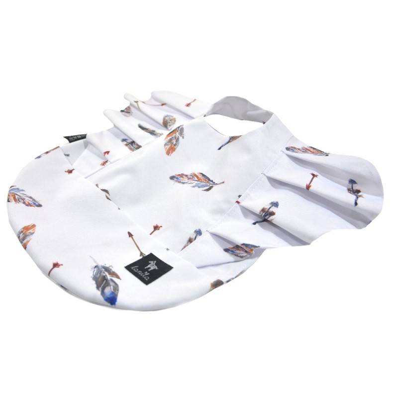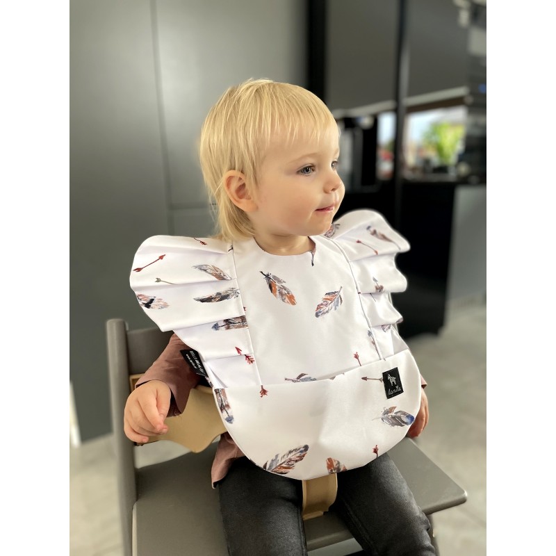 Unikalny wzór w ręcznie malowane pióra sprawia, że śliniaczek jest również śliczną ozdobą dla każdego malucha.