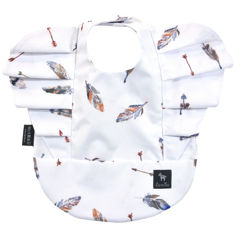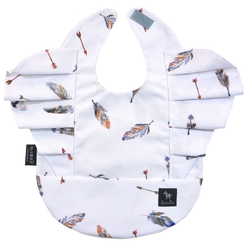 Śliniak dla niemowlaka marki Lanila posiada praktyczną kieszonkę, która złapie wszystkie spadające resztki jedzenia. Wszyta falbanka dodaje całości uroku oraz elegancji.