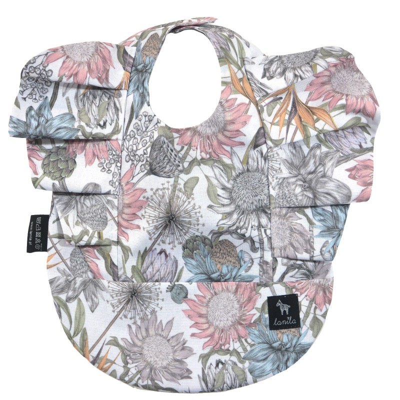 Śliniak dla niemowlaka marki Lanila posiada praktyczną kieszonkę, która złapie wszystkie spadające resztki jedzenia. Wszyta falbanka dodaje całości uroku oraz elegancji.