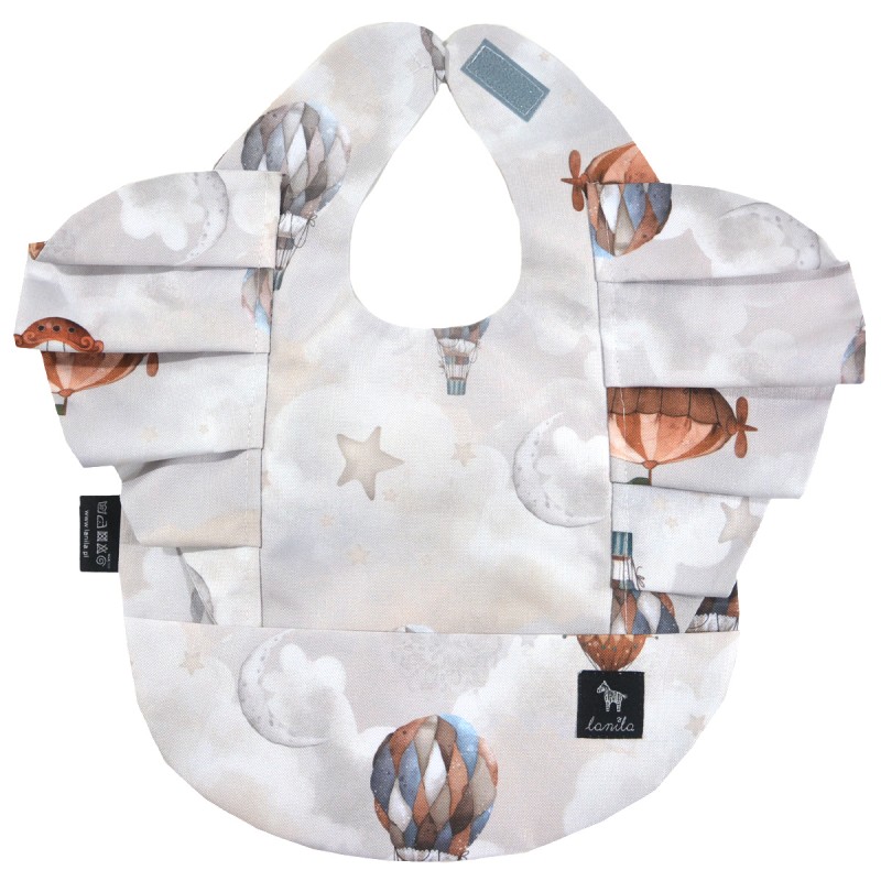 Śliniak dla niemowlaka marki Lanila posiada praktyczną kieszonkę, która złapie wszystkie spadające resztki jedzenia. Wszyta falbanka dodaje całości uroku oraz elegancji.