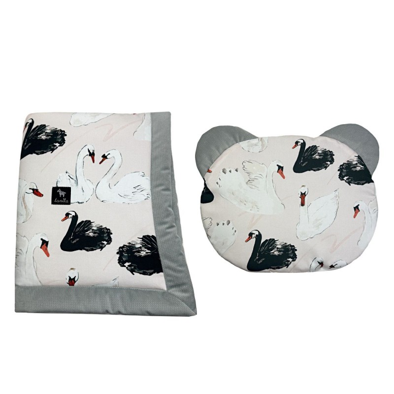 Zestaw poduszka miś oraz kocyk dla niemowlaka 60x70cm z kolekcji Swans to absolutny must have każdej mamy. Taki komplet świetnie sprawdzi się jako pierwsza wyprawka dla noworodka.
