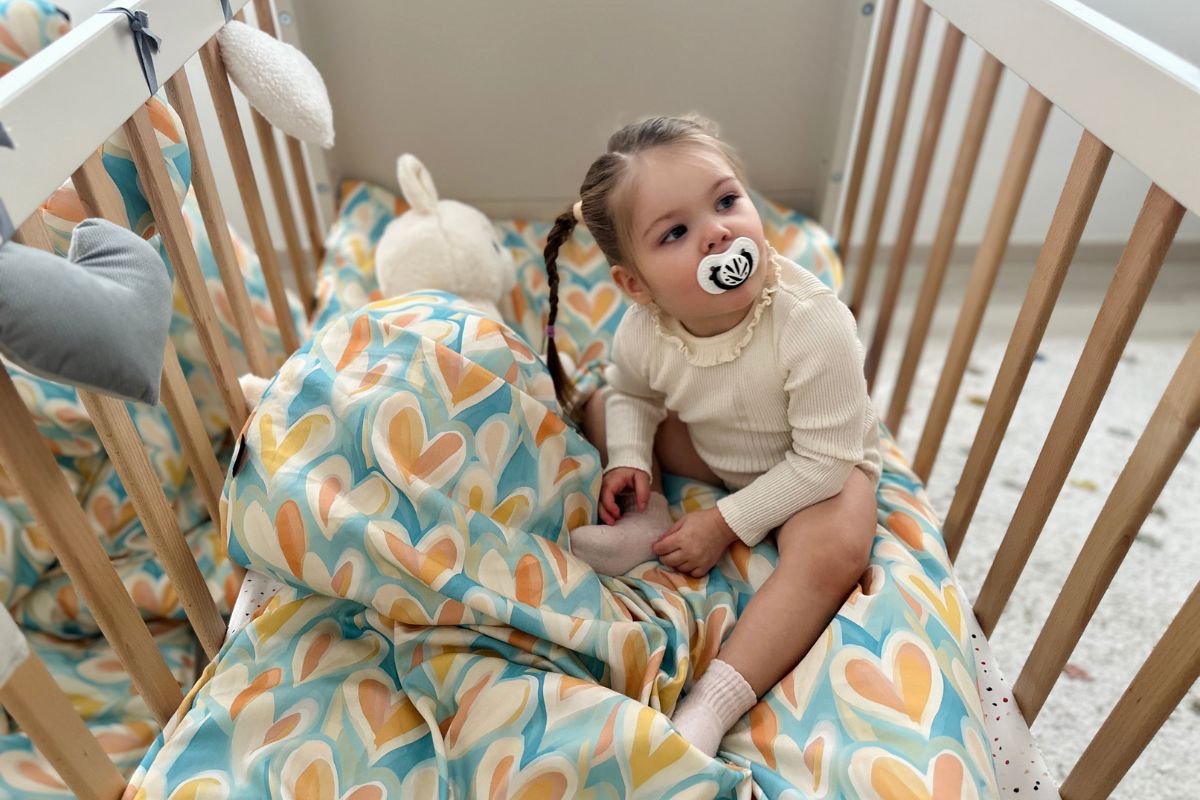 Miękka, oddychająca pościel z naturalnych tkanin zapewnia komfort snu i pięknie dopełnia aranżację łóżeczka.