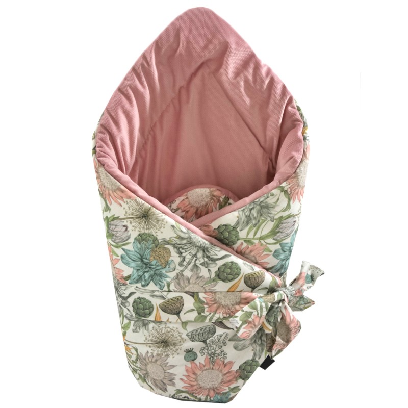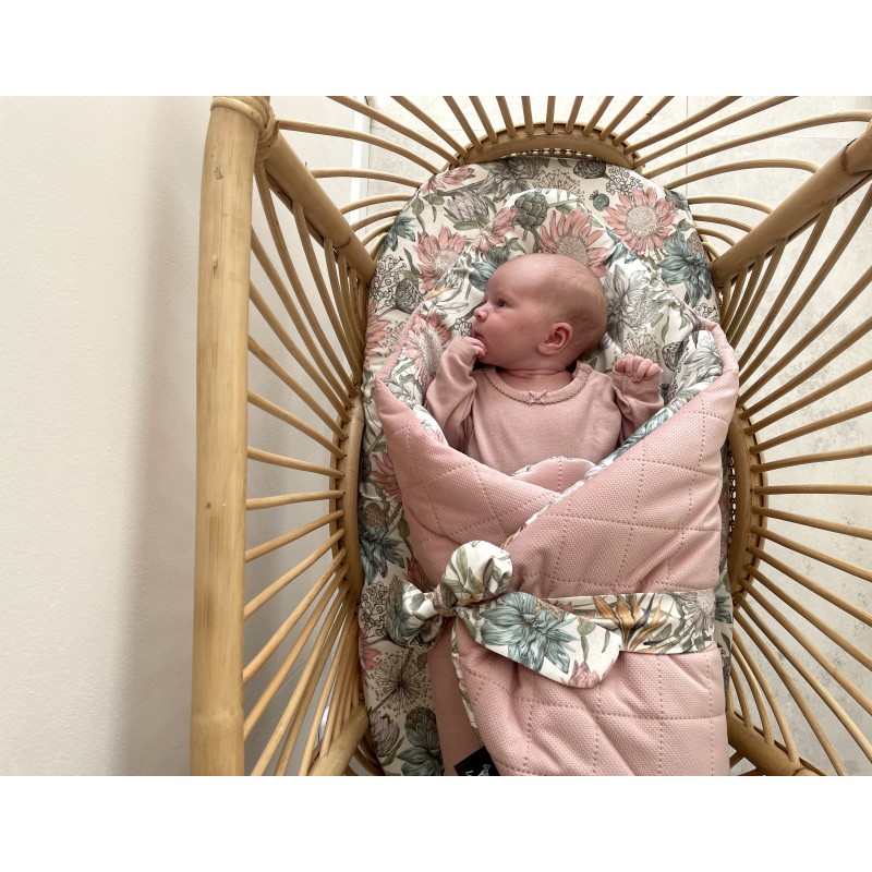 Rożek dla niemowlaka Vintage Meadow z jednej strony wykonany został z miękkiej i delikatnej bawełny, zadrukowanej autorskim wzorem. Z drugiej uszyty został z wysokiej jakości dzianiny Velvet.