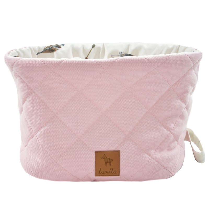 Pojemnik na akcesoria marki Lanila uszyty został z najwyższej jakości certyfikowanej bawełny oraz dzianiny Velvet. Środek to antyalergiczne, silikonowe wypełnienie, dzięki  czemu pojemnik może być umieszczony w pokoju, w którym śpi niemowlę. Idealny do przechowywania pieluszek, szczotek, ubranek czy produktów do codziennej pielęgnacji Maluszka. Świetnie pasuje jako praktyczny, a zarazem piękny dodatek do dziecięcego pokoju.