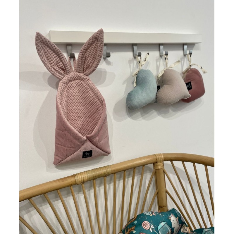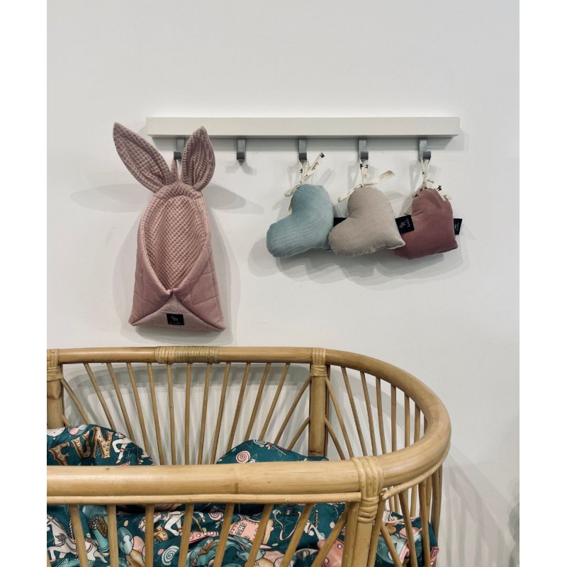 Pojemnik z uszami marki Lanila uszyty został z najwyższej jakości certyfikowanej bawełny waflowej oraz dzianiny Velvet. Środek to cienkie, antyalergiczne, silikonowe wypełnienie, dzięki czemu pojemnik może być powieszony w pokoju, w którym śpi niemowlę. Idealnie sprawdzi się również w łazience jako koszyczek na gumki do włosów, szczotki czy drobne produkty do codziennej pielęgnacji.