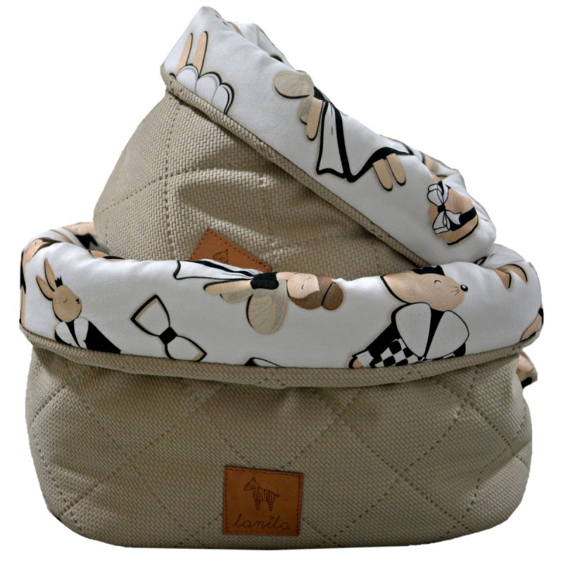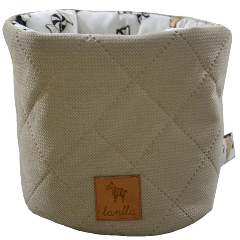 Pojemnik na akcesoria marki Lanila uszyty został z najwyższej jakości certyfikowanej bawełny oraz dzianiny Velvet. Środek to antyalergiczne, silikonowe wypełnienie, dzięki  czemu pojemnik może być umieszczony w pokoju, w którym śpi niemowlę. Idealny do przechowywania pieluszek, szczotek, ubranek czy produktów do codziennej pielęgnacji Maluszka. Świetnie pasuje jako praktyczny, a zarazem piękny dodatek do dziecięcego pokoju.