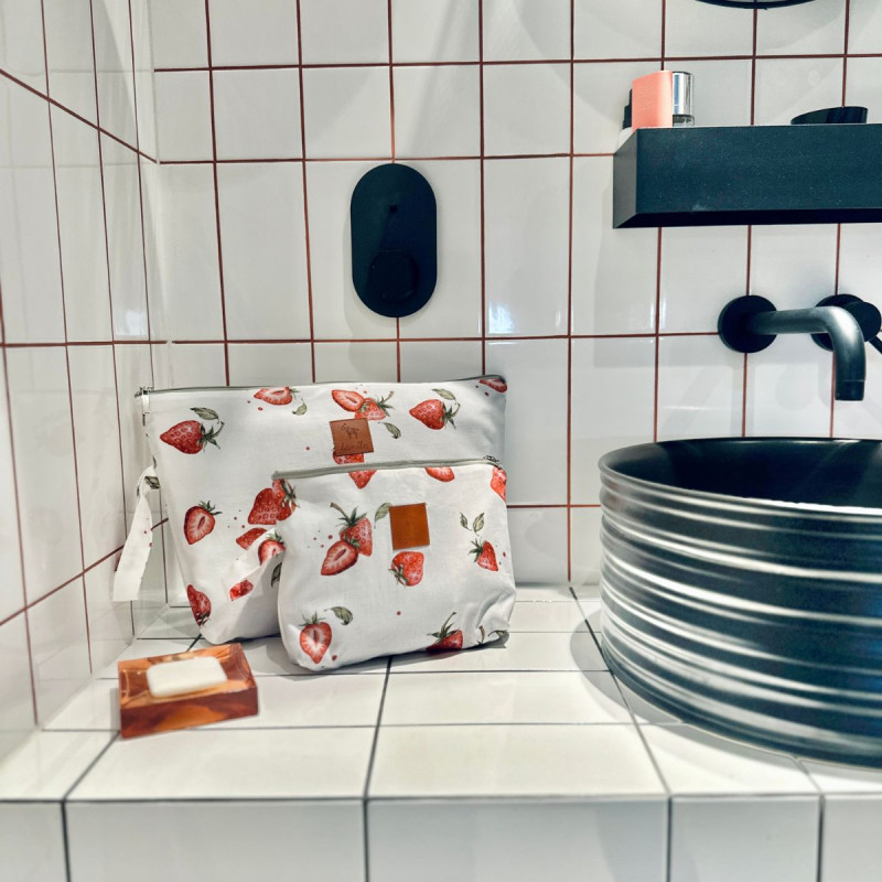 Kolorowa kosmetyczka I Love Strawberry wykonana została z polskiej bawełny satynowej z trwałym, delikatnym nadrukiem. Wnętrze pokrywa tkanina wodoodporna, która zabezpiecza przed ewentualnym przeciekaniem rozlanych cieczy i gwarantuje łatwość czyszczenia. Z tego powodu jest to wymarzona kosmetyczka na dziecięce akcesoria – butelkę z mlekiem, mokre ubranko czy ulubione zabawki. Ale nie tylko na dziecięce!