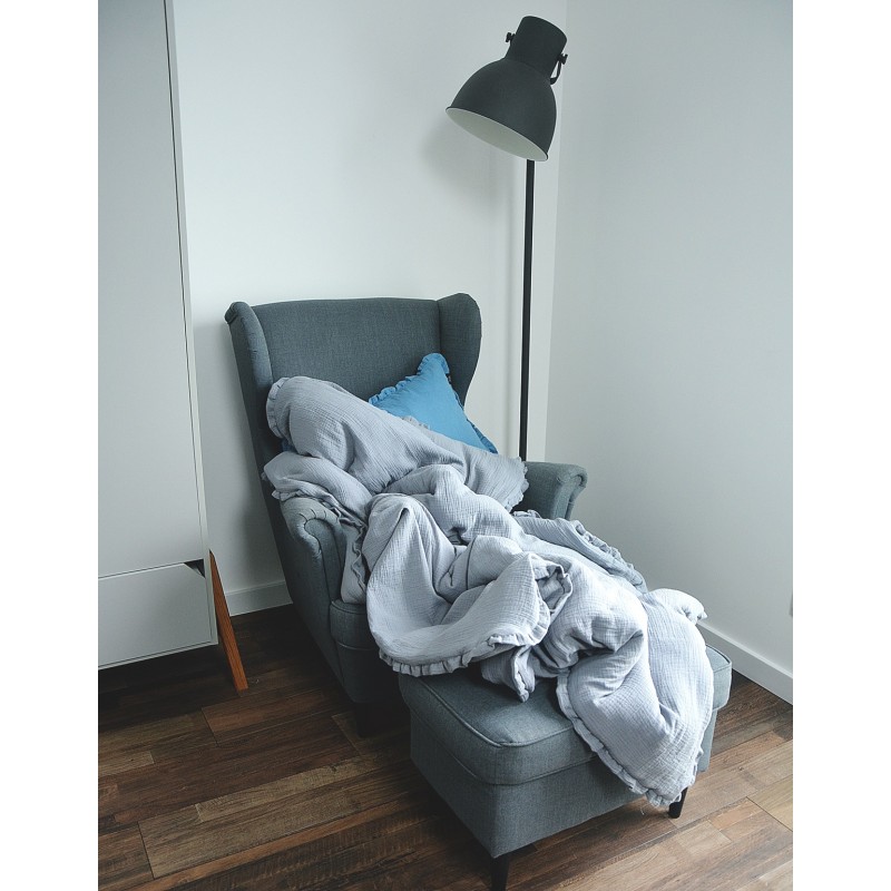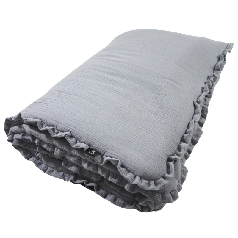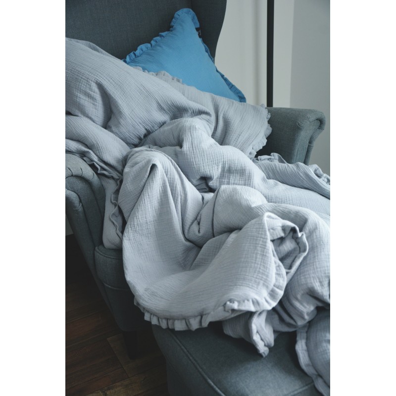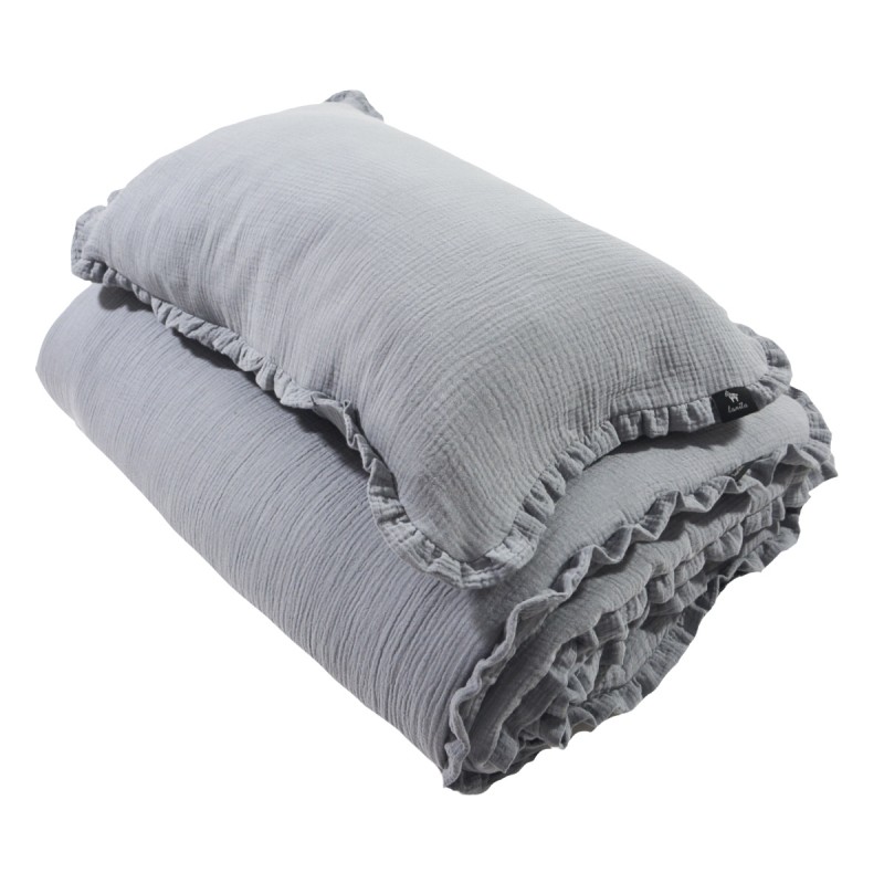 Niesamowicie miękki i delikatny w dotyku komplet pościeli muślinowej, wykonanej w 100% z bawełny. W skład kompletu wchodzi poszewka na poduszkę oraz kołdra z wszytym antyalergicznym wypełnieniem. Całość ozdobione zostało piękną, ręcznie szytą falbanką.
