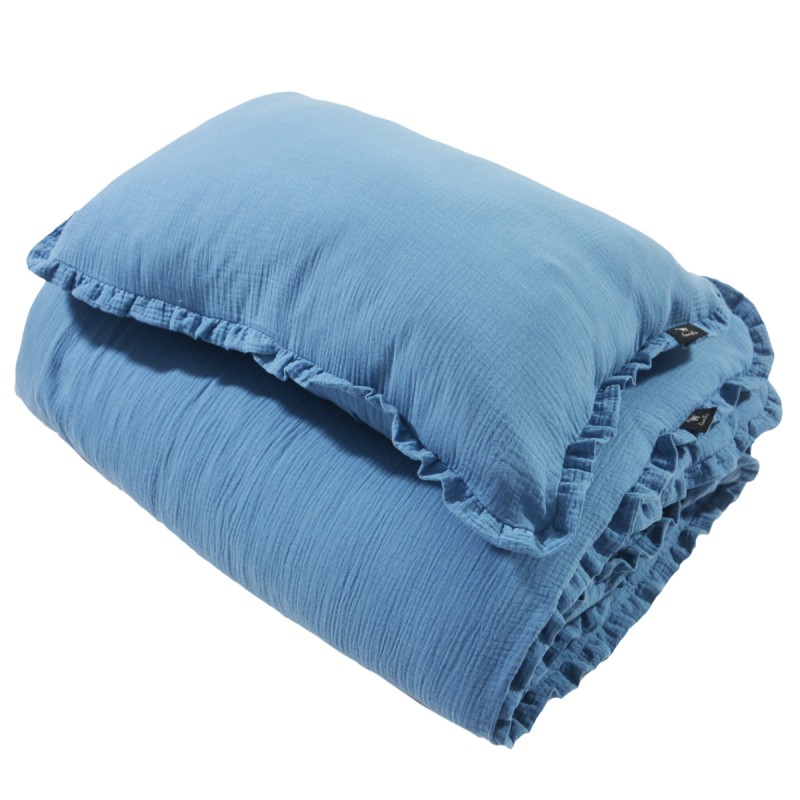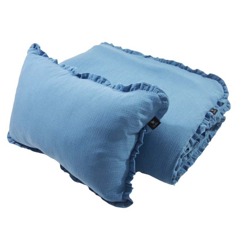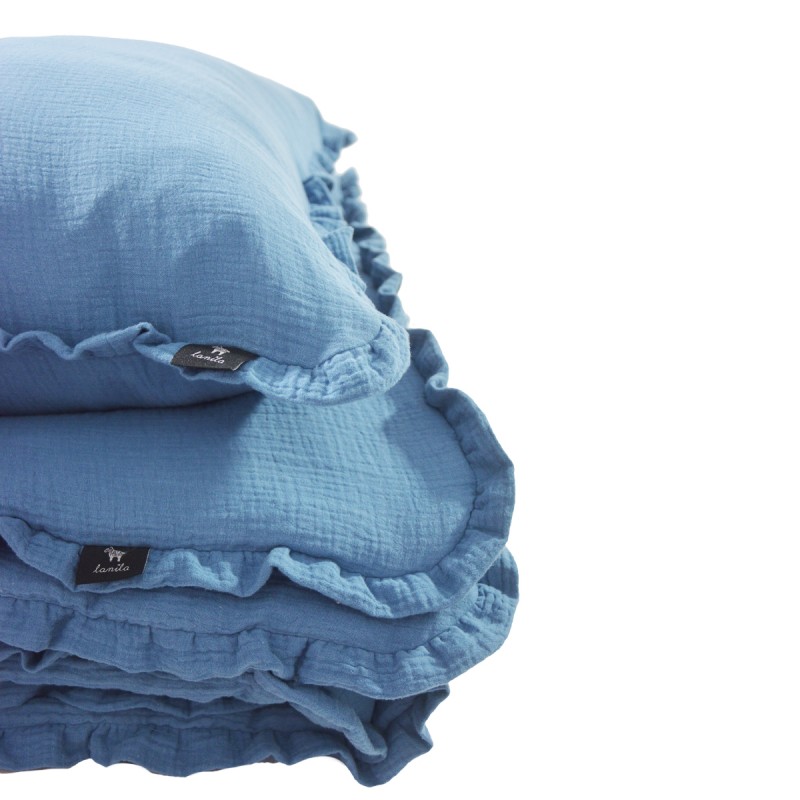 Niesamowicie miękki i delikatny w dotyku komplet pościeli muślinowej, wykonanej w 100% z bawełny. W skład kompletu wchodzi poszewka na poduszkę oraz kołdra z wszytym antyalergicznym wypełnieniem. Całość ozdobione zostało piękną, ręcznie szytą falbanką.