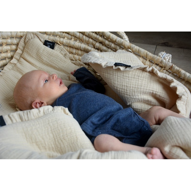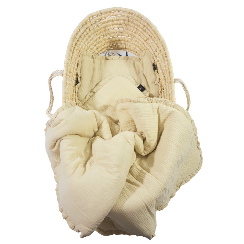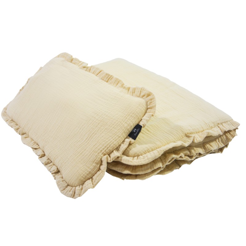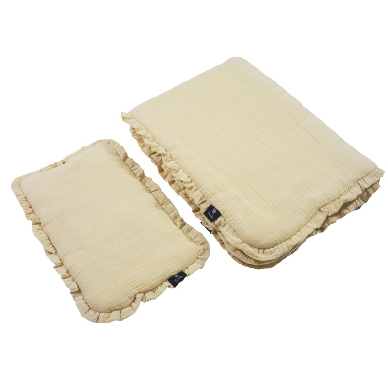 Niesamowicie miękki i delikatny w dotyku komplet pościeli muślinowej, wykonanej w 100% z bawełny. W skład kompletu wchodzi poduszka oraz kołderka z wszytym antyalergicznym wypełnieniem. Całość ozdobione jest piękną, ręcznie szytą falbanką.