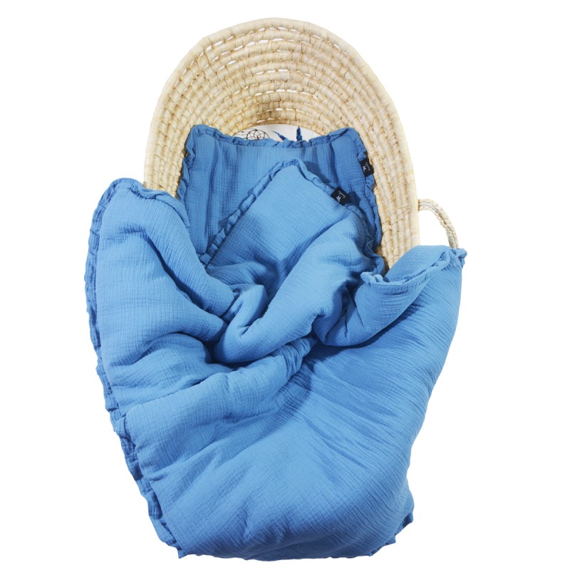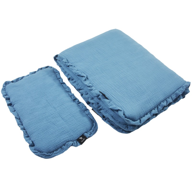 Niesamowicie miękki i delikatny w dotyku komplet pościeli muślinowej, wykonanej w 100% z bawełny. W skład kompletu wchodzi poduszka oraz kołderka z wszytym antyalergicznym wypełnieniem. Całość ozdobione jest piękną, ręcznie szytą falbanką.