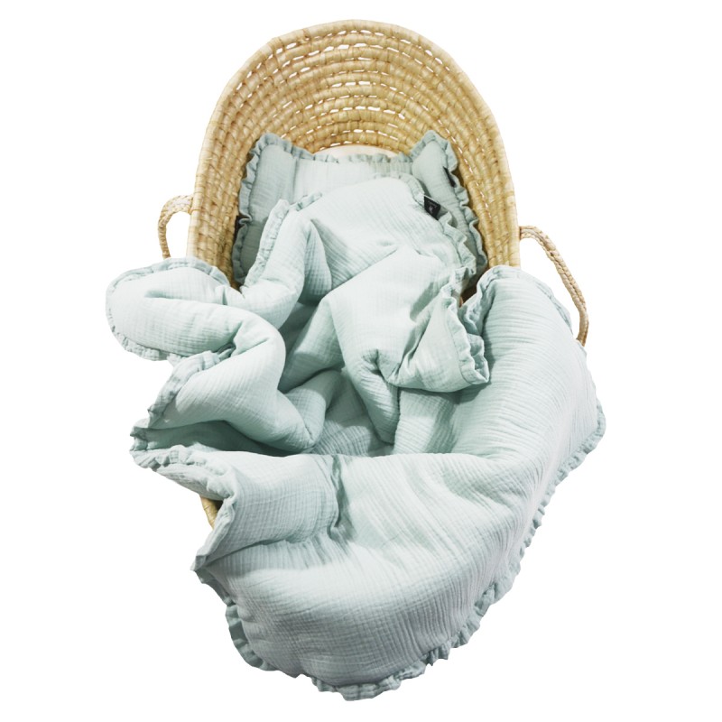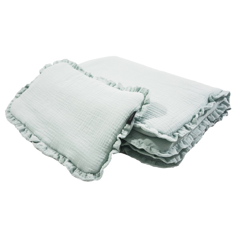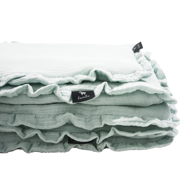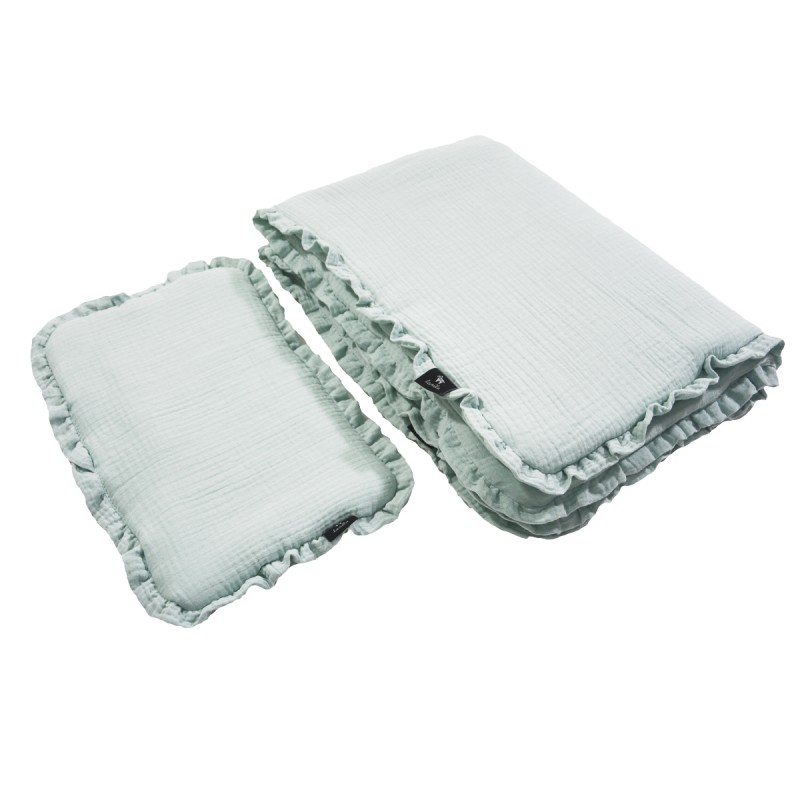 Niesamowicie miękki i delikatny w dotyku komplet pościeli muślinowej, wykonanej w 100% z bawełny. W skład kompletu wchodzi poduszka oraz kołderka z wszytym antyalergicznym wypełnieniem. Całość ozdobione jest piękną, ręcznie szytą falbanką.