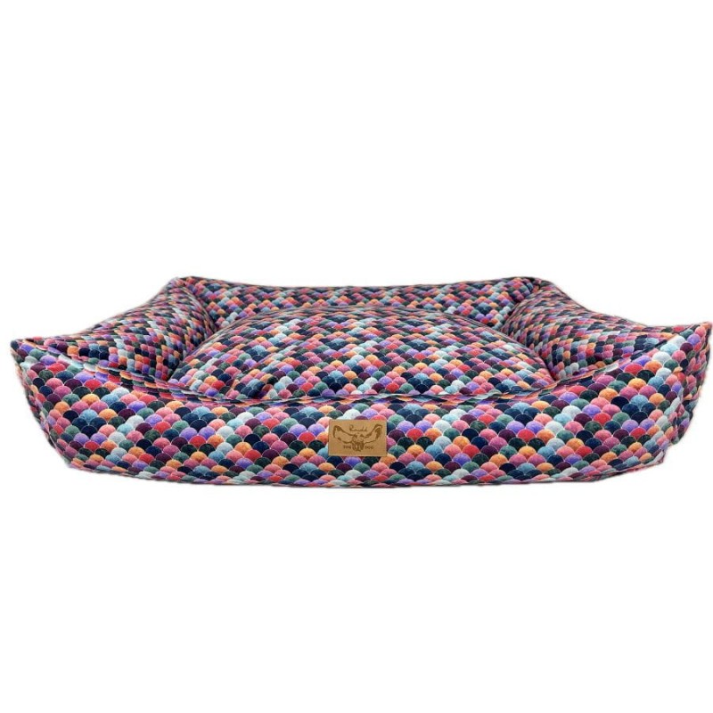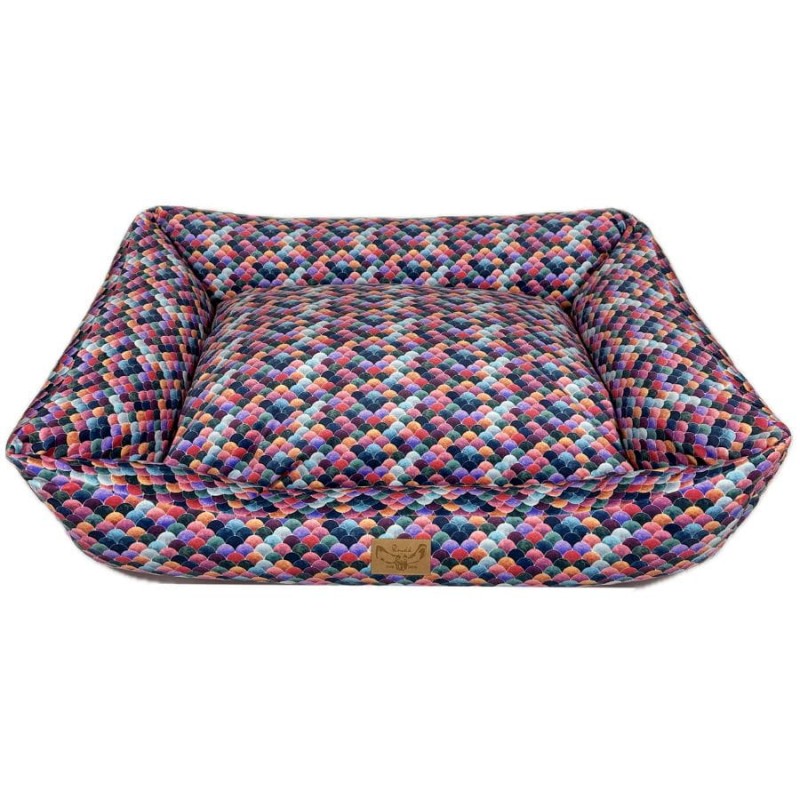 Wykonane z najwyższej jakości, trwałych materiałów tapicerskich typu welur, nasz kojec dla dużego psa zapewnia trwałość i odporność na codzienne zużycie. Dodatkowo materiał ten zadrukowany został naszymi autorskimi wzorami, co nadaje całości niesamowitego designu. Dzięki temu legowiska na żywo prezentują się bardzo stylowo i przypominają bardziej designerski mebel niż zwykły kojec dla psa, płynnie integrując legowisko z Twoją przestrzenią życiową.