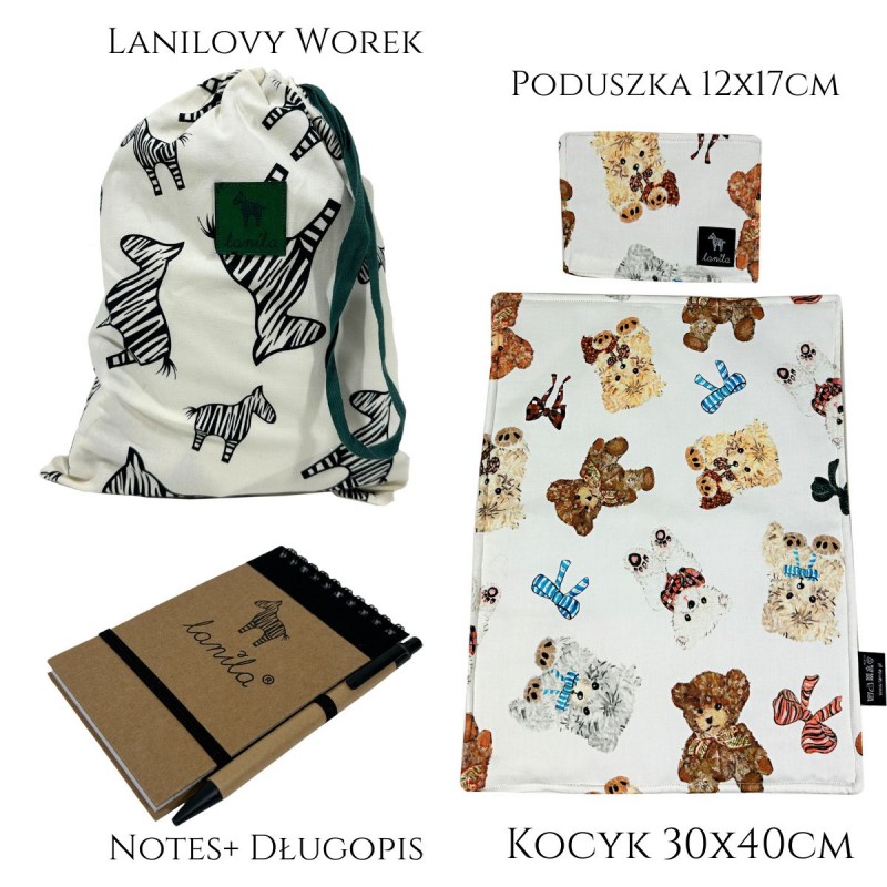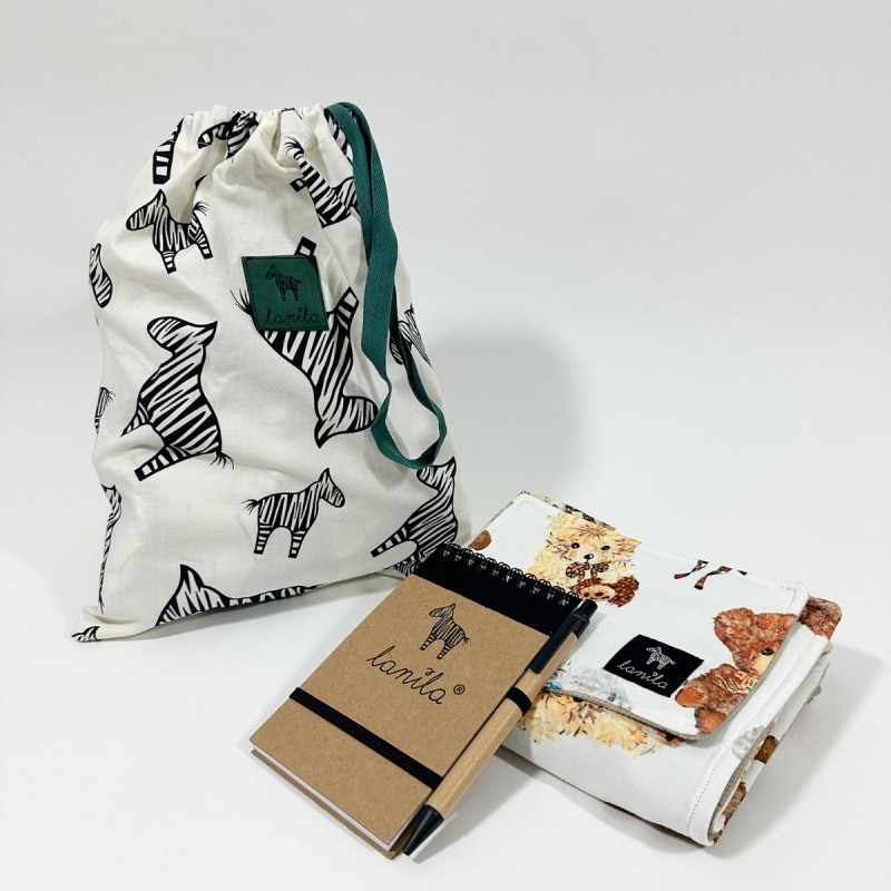 Każdy komplet pościeli dla lalek zapakowany jest w elegancki a zarazem praktyczny, bawełniany worek z logo Lanila, który może być przydatny do chowania ulubionych skarbów. Dodatkowo do kompletu dokładamy ekologiczny notesik z logo Lanila wraz z długopisem, dlatego całość to idealny pomysł na prezent dla każdej małej Księżniczki.
