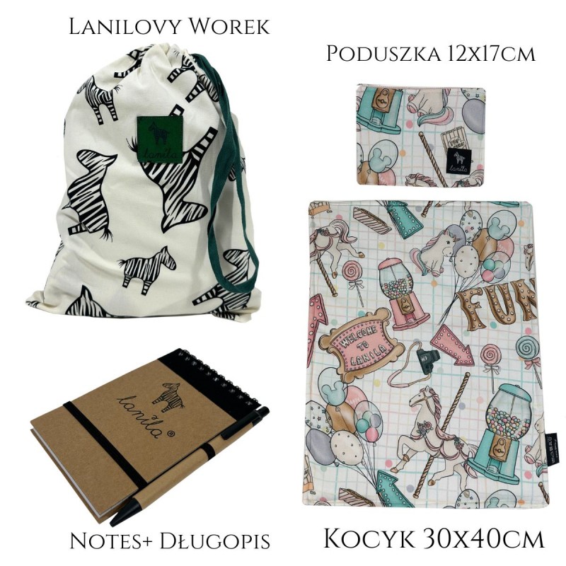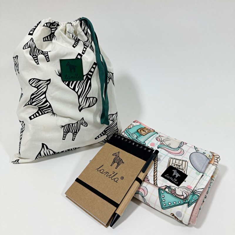 Każdy komplet pościeli dla lalek zapakowany jest w elegancki a zarazem praktyczny, bawełniany worek z logo Lanila, który może być przydatny do chowania ulubionych skarbów. Dodatkowo do kompletu dokładamy ekologiczny notesik z logo Lanila wraz z długopisem, dlatego całość to idealny pomysł na prezent dla każdej małej Księżniczki.