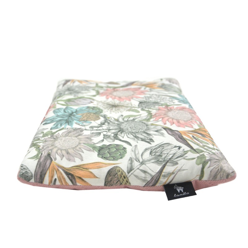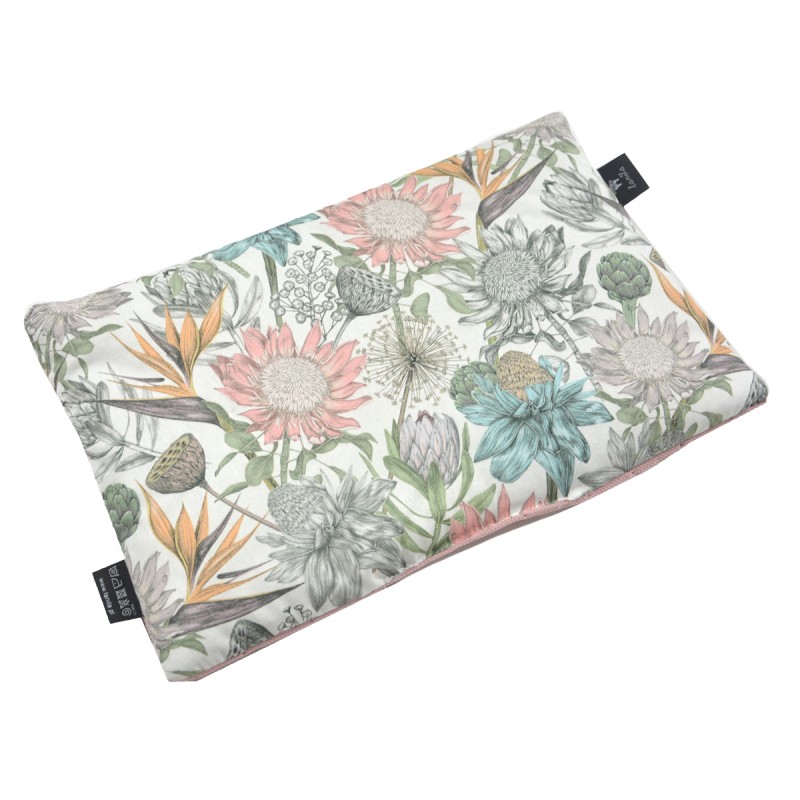 Poduszka dla dziecka Velvet z kolekcji Lucy Bloom z jednej strony pokryta została bardzo miękką satynową bawełną z trwałym nadrukiem, z drugiej użyta została zupełnie nowa dzianina Velvet.