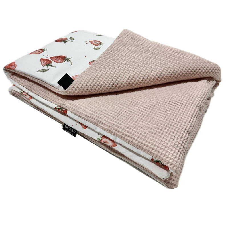 Niezwykle miękki koc dla dzieci Wafel I Love Strawberry 75x100cm. Kocyk dla dziecka wykonany został w 100% z naturalnych tkanin bawełnianych – drukowanej oraz waflowej.