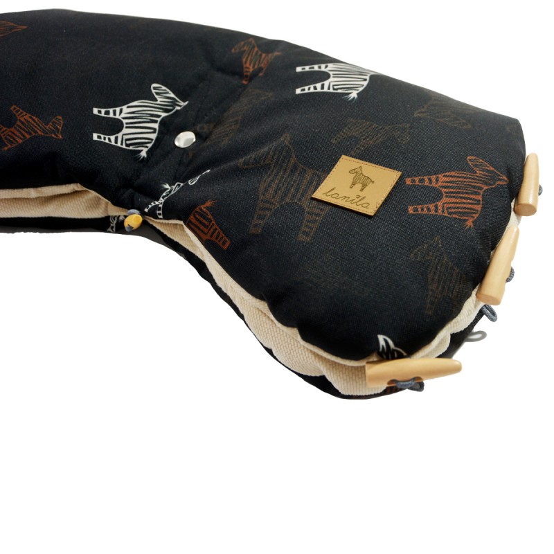 Wodoodporna Mufka do Wózka Latte Follow the Zebra to oryginalne wyposażenie pozwalające ochronić dłonie w czasie prowadzenia dziecięcego wózka. Mufka zabezpiecza dłonie przed chłodem i deszczem i może być zamontowana na stałe do drążka wózków spacerowych i gondoli.