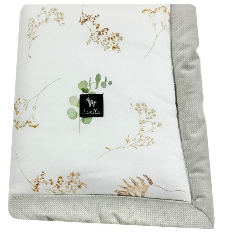 Niezwykle miękki kocyk Velvet Silver Flora 60x70cm sygnowany logo Lanila. Kocyk wykonany został z wysokogatunkowej bawełny oraz delikatnego w dotyku, eleganckiego Velvetu.
