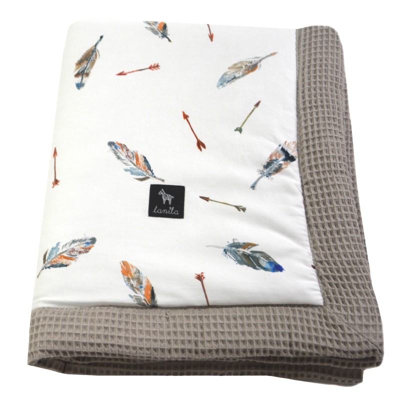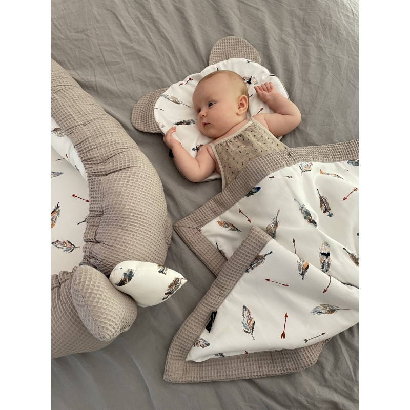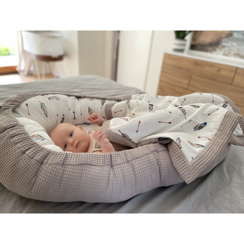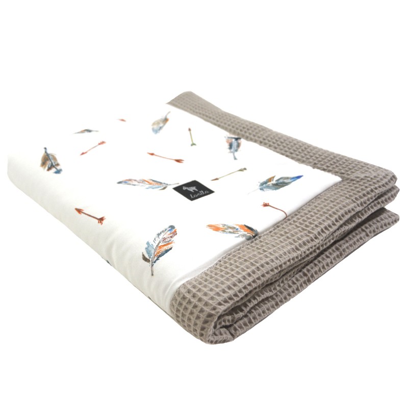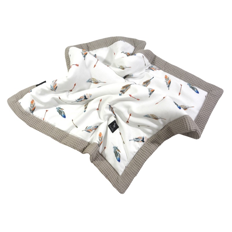 Ciepłą i przytulną miękkość kocyka dla noworodka zapewniają naturalne tkaniny użyte w czasie produkcji.  Jedna warstwa to zadrukowana naszymi autorskimi wzorami bawełna Premium. Druga strona to wysokiej jakości, bardzo miękki bawełniany wafel. Tkanina waflowa świetnie sprawdza się w akcesoriach dla dzieci i niemowląt, ponieważ jest bardzo delikatna i przyjemna w dotyku.  Wafel tworzy również puszystą obwódkę, nadając kocykowi przytulnego charakteru.