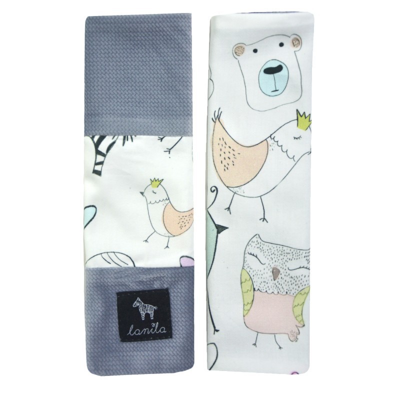 Uniwersalna i praktyczna wkładka do wózka Grey Tender Friends, ochraniacze na pasy, pasek oraz bezpieczna poduszka motylek antywstrząsowy – podstawowy zestaw każdej wyprawy. Z produktami marki Lanila każda wycieczka będzie przyjemnością.