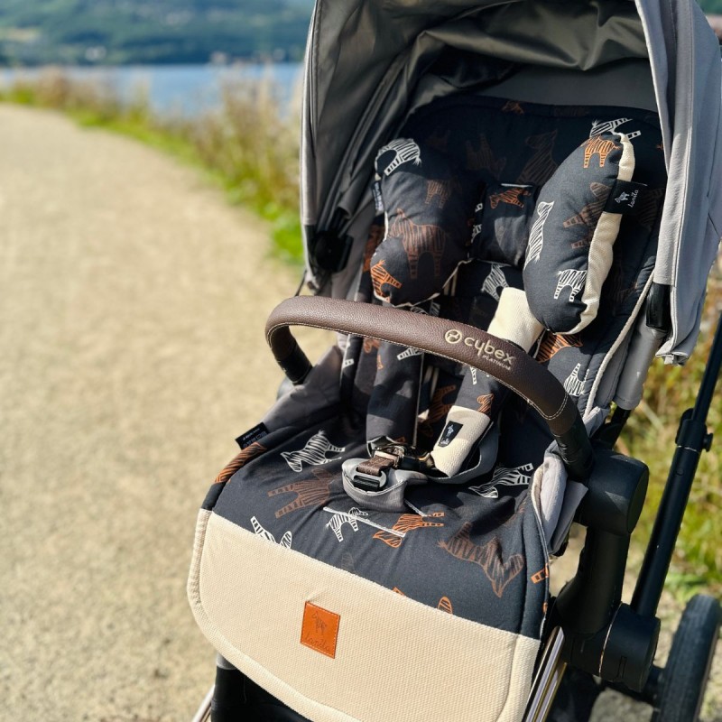 Uniwersalna i praktyczna wkładka do wózka Latte Follow The Zebra, ochraniacze na pasy, pasek oraz bezpieczna poduszka motylek antywstrząsowy – podstawowy zestaw każdej wyprawy. Z produktami marki Lanila każda wycieczka będzie przyjemnością.