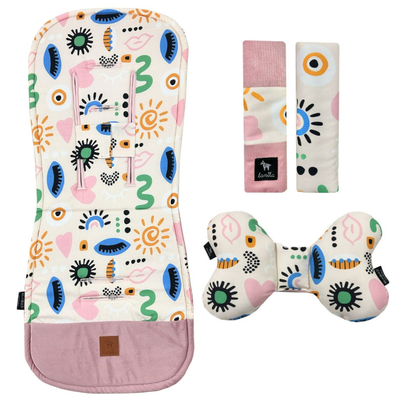 Uniwersalna i praktyczna wkładka do wózka Modern ochraniacze na pasy, pasek oraz bezpieczna poduszka motylek antywstrząsowy – podstawowy zestaw każdej wyprawy. Z produktami marki Lanila każda wycieczka będzie przyjemnością.