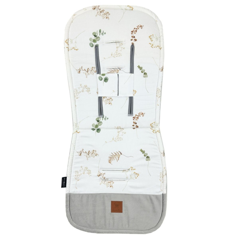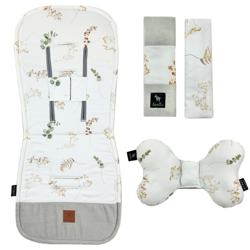 Uniwersalna i praktyczna wkładka do wózka Silver Flora ochraniacze na pasy, pasek oraz bezpieczna poduszka motylek antywstrząsowy – podstawowy zestaw każdej wyprawy. Z produktami marki Lanila każda wycieczka będzie przyjemnością.