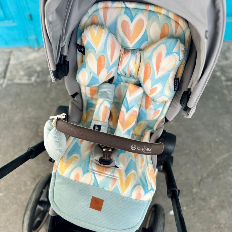 Uniwersalna i praktyczna wkładka do wózka Pastel Amour ochraniacze na pasy, pasek oraz bezpieczna poduszka motylek antywstrząsowy – podstawowy zestaw każdej wyprawy. Z produktami marki Lanila każda wycieczka będzie przyjemnością.