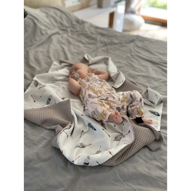 Dzięki temu, że kocyki Light nie posiadają wypełnienia idealnie sprawdzają się jako cienki otulacz czy lekki  koc dla starszych dzieci. Kocyk dla dziecka z kolekcji Wafel wykonany został z naturalnych tkanin - Jedna warstwa to zadrukowana naszymi autorskimi wzorami bawełna Premium. Druga strona to wysokiej jakości, bardzo miękki bawełniany wafel. Tkanina waflowa świetnie sprawdza się w akcesoriach dla dzieci i niemowląt, ponieważ jest bardzo delikatna i przyjemna w dotyku.