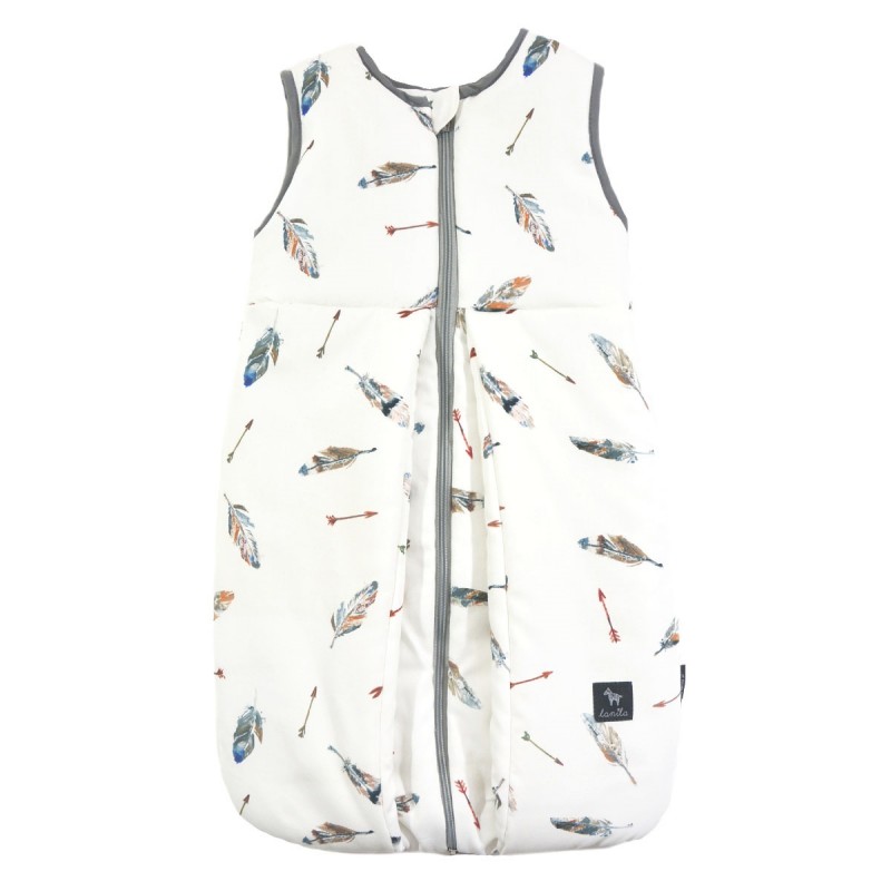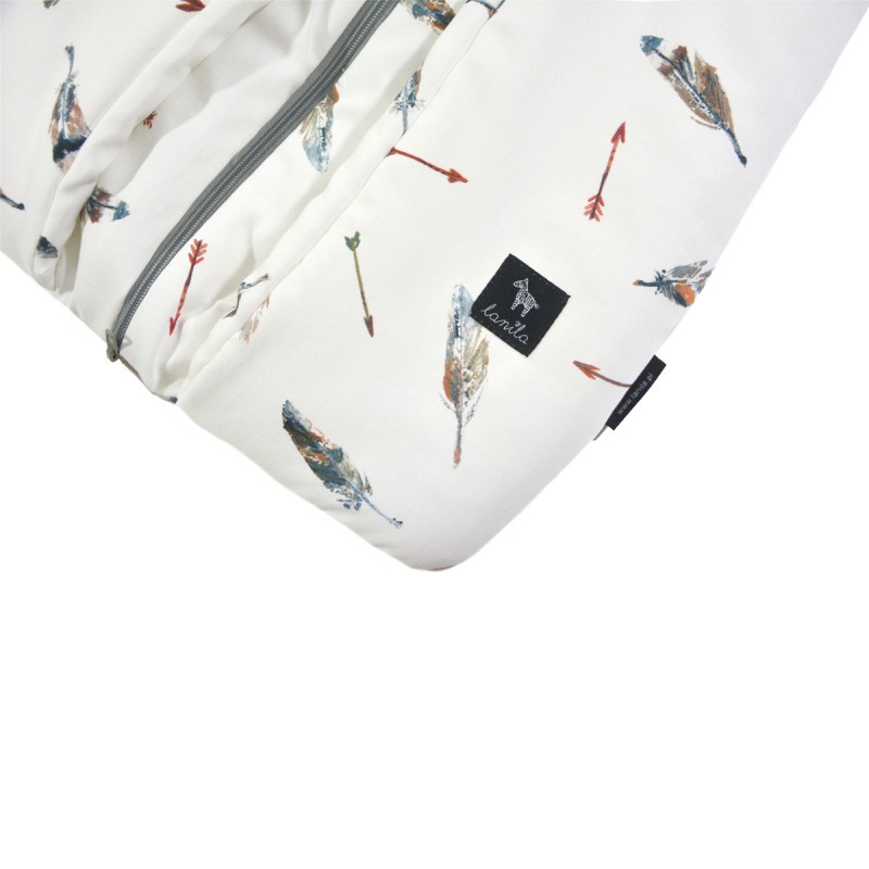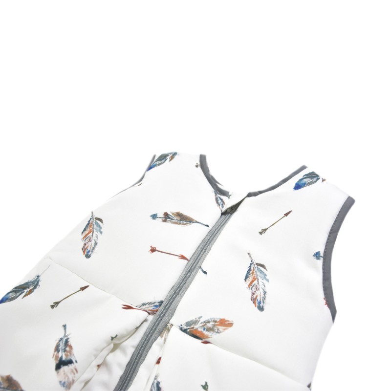 Dzięki specjalnemu klinowi w przedniej części śpiworka Dziecko może swobodnie poruszać nóżkami w czasie leżenia oraz snu. Miejsca, w których śpiworek styka się z rączkami oraz szyją Dziecka wykończone zostały stylową, a zarazem bardzo miękką wypustką bawełnianą, która nie powoduje podrażnień. Dodatkowo górna część zamka posiada specjalną zakładkę, która zabezpiecza przed zahaczeniem Malucha zapinanym zamkiem.