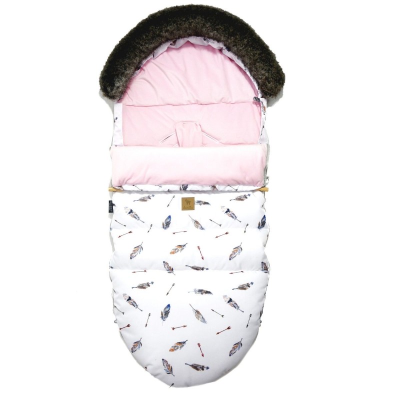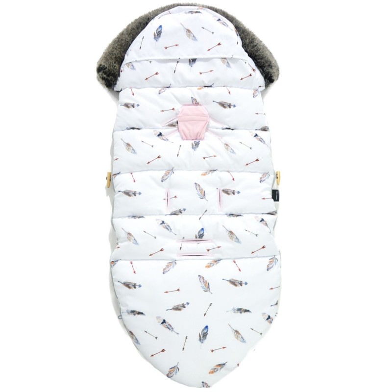 Śpiworek dziecięcy posiada także zintegrowany, ciepły kaptur wykończony stylowym, sztucznym futrem. Futro zapinane jest na małe guziki, dzięki czemu można go całkowicie odczepić. Kaptur posiada również sznurową gumę, dzięki czemu można regulować jego wielkość. Dodatkowa zakładka w tylnej części kaptura pozwala na zaczepienie śpiworka w tylnej części wózka - uniemożliwia to zsunięcie się śpiwora podczas jego użytkowania.