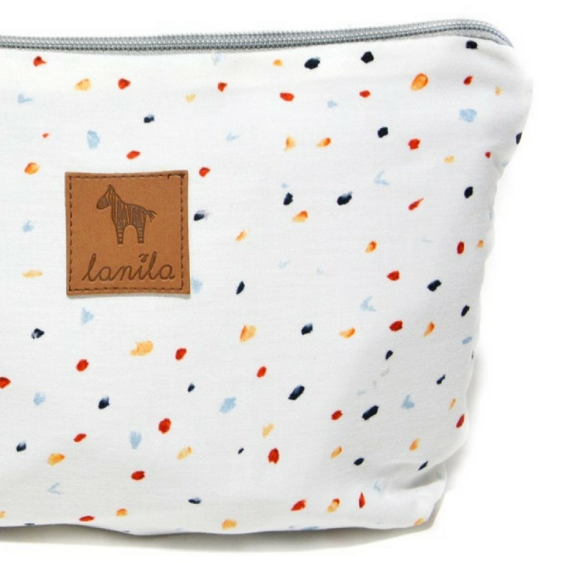 Kolorowa kosmetyczka Mini Dots wykonana została z polskiej bawełny satynowej z trwałym, odważnym nadrukiem. Wnętrze pokrywa tkanina wodoodporna, która zabezpiecza przed ewentualnym przeciekaniem rozlanych cieczy i gwarantuje łatwość czyszczenia. Z tego powodu jest to wymarzona kosmetyczka na dziecięce akcesoria – butelkę z mlekiem, mokre ubranko czy ulubione zabawki. Ale nie tylko na dziecięce!