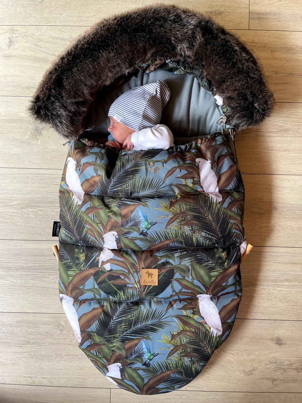 Śpiworek zimowy z futrem Khaki Tropical Velvet to doskonała propozycja na zbliżającą się wielkimi korkami jesień oraz zimę. Śpiworek niemowlęcy posiada kaptur z futrzanym wykończeniem, dzięki czemu nawet mrozy nie będą straszne maluszkowi. Doskonale sprawdzi się do spacerowego wózka, fotelika samochodowego, albo gondoli. Tym, co go wyróżnia, jest wodoodporny materiał oraz wykończenia z miękkiego Velvetu.