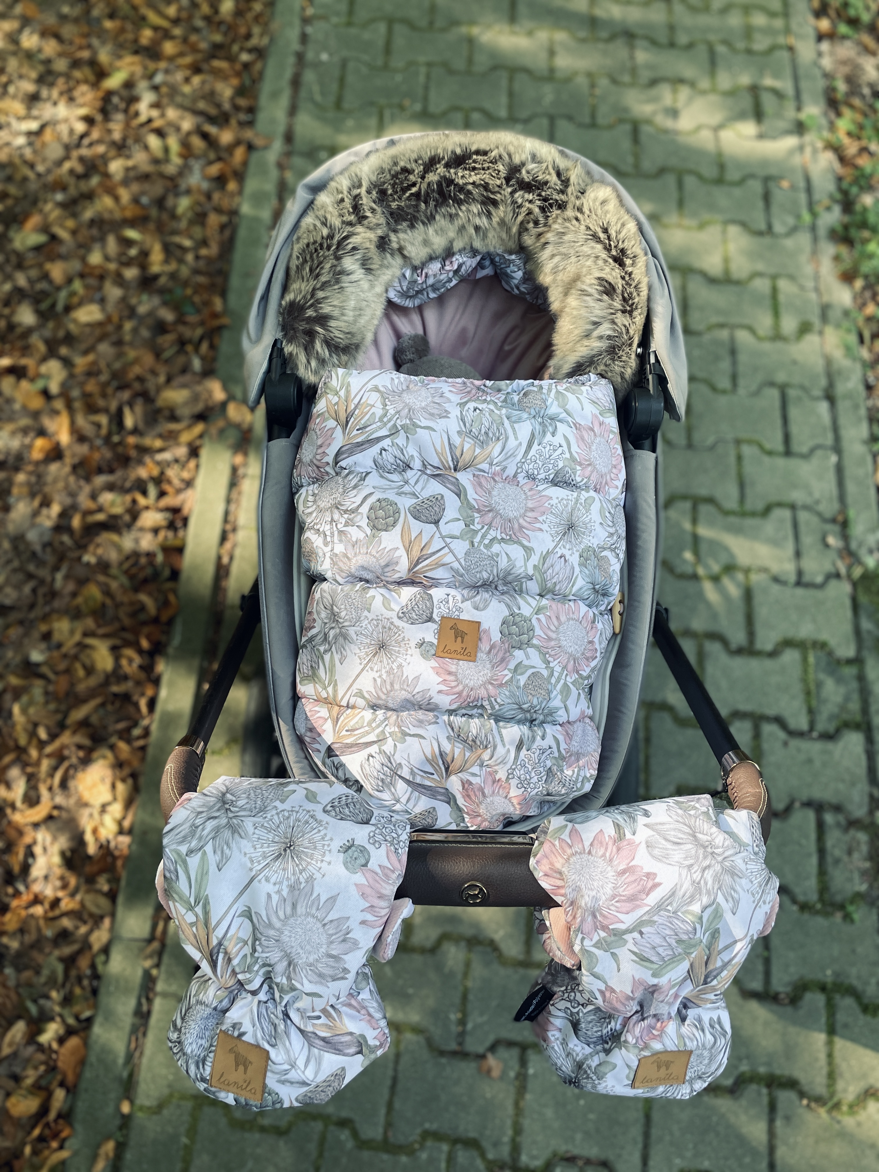 Zestaw III - zimowy śpiworek dziecięcy + rękawice + organizer do wózka dziecięcego