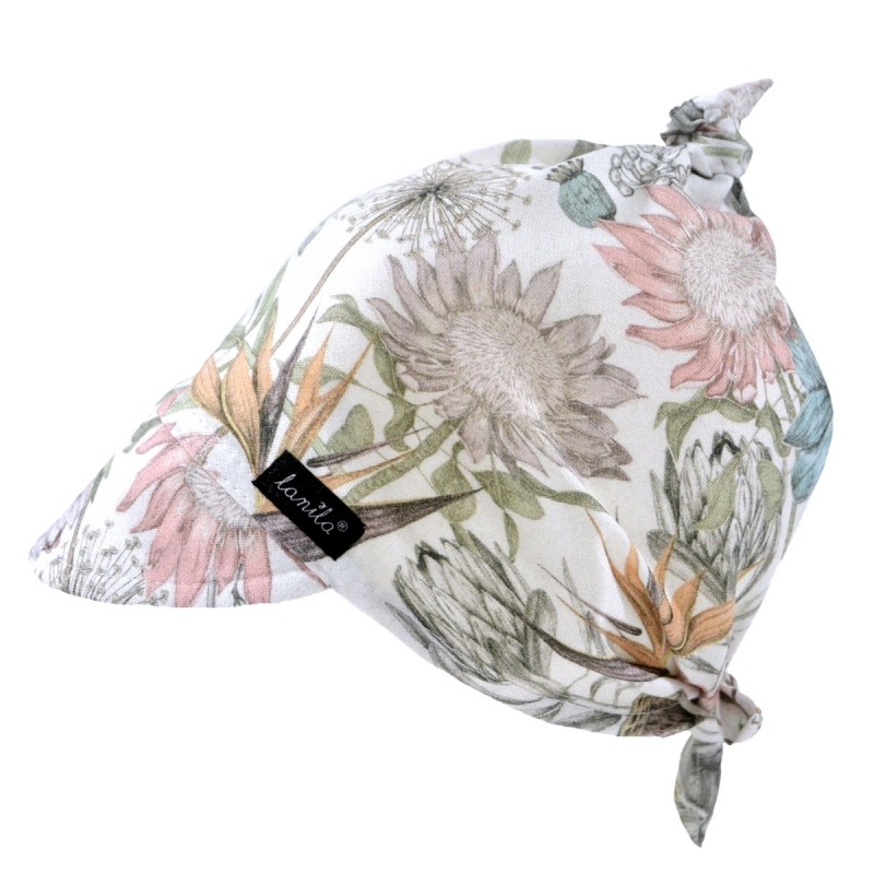 Bawełniana Chusta na głowę z daszkiem Vintage Meadow w całości wykonana została z miękkiej, atestowanej bawełny satynowej z trwałym nadrukiem. Idealnie ochroni główkę dziecka przed przegrzaniem, a dzięki wykorzystaniu bardzo miękkiej tkaniny nie spowoduje podrażnień oraz zapobiegnie przetarciom nawet na wrażliwej skórze Dziecka.