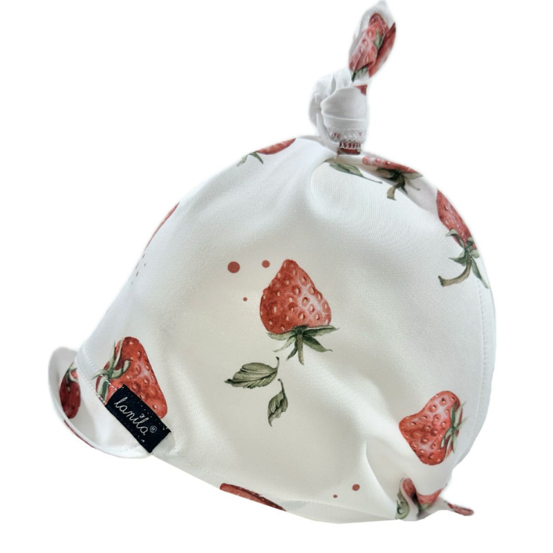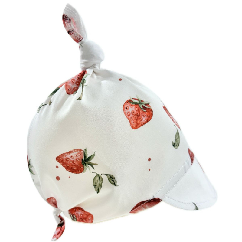 Bawełniana Chusta na głowę z daszkiem I Love Strawberry w całości wykonana została z miękkiej, atestowanej bawełny satynowej z trwałym nadrukiem. Idealnie ochroni główkę dziecka przed przegrzaniem, a dzięki wykorzystaniu bardzo miękkiej tkaniny nie spowoduje podrażnień oraz zapobiegnie przetarciom nawet na wrażliwej skórze Dziecka.