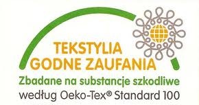 Certyfikat OEKO-TEX 100 - certyfikat ten jest wiodącym w świecie znakiem bezpieczeństwa wyrobów włókienniczych. Produkty, którym przyznano ten znak, są wolne od substancji szkodliwych dlatego są w pełni bezpieczne dla dzieci i niemowląt.