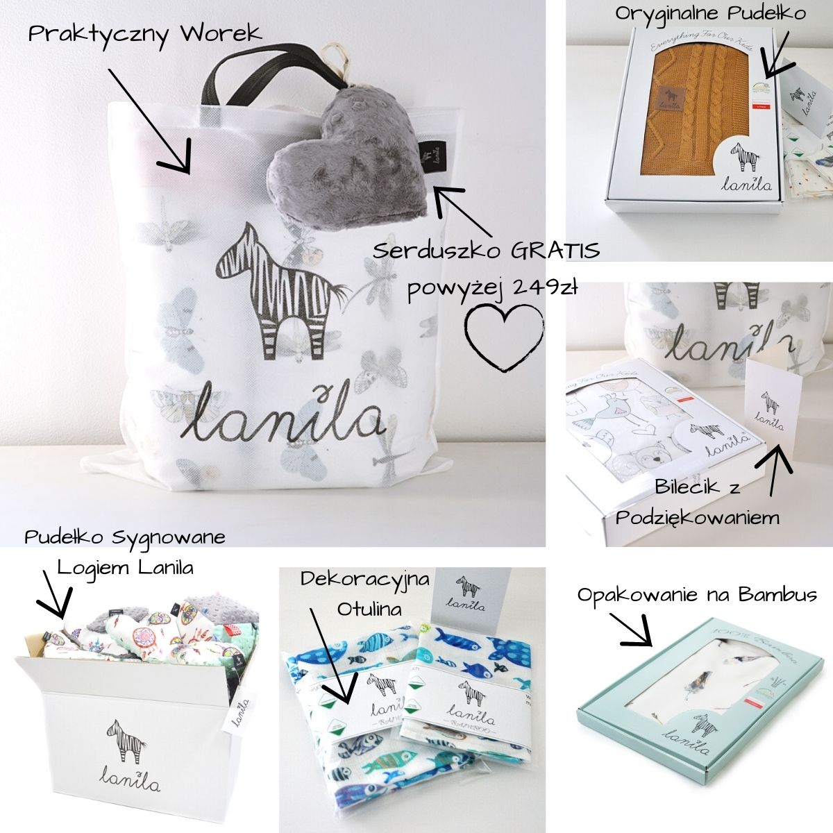 Kupując produkty sygnowane logiem Lanila nie otrzymujecie tylko samego produktu. W zależności jaki produkt wybraliście będzie on spakowany w firmowy lanilowy bardzo praktyczny worek, eleganckie, idealne na prezent pudełko , szalone wakacyjne miętowe opakowanie z ananasowymi okularami lub dekoracyjną otulinę :). Do każdej paczki dołączamy firmowy bilecik oraz markową etykietkę, a do zamówień powyżej 249zł dokładamy gratis mini serduszko z Minky lub Velvet!