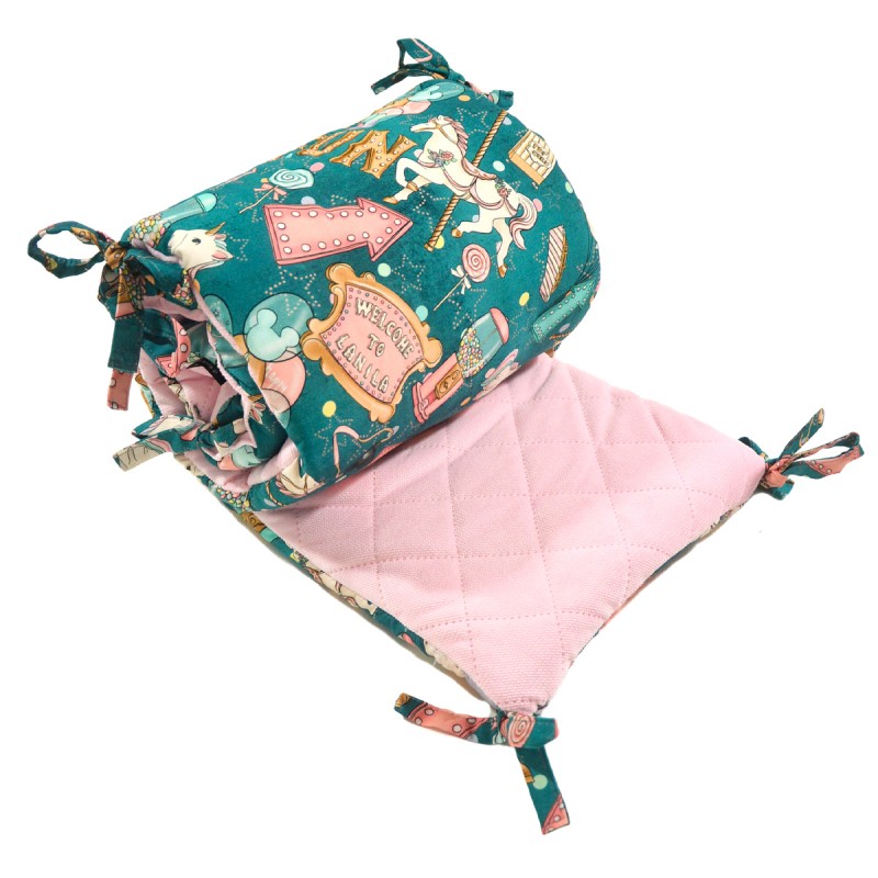 Ochraniacze do łóżeczka Lanila mają wymiary 70x70x70 cm i wysokość aż 30 cm. Jedną stronę pokrywa wysokiej klasy bawełna satynowa z pięknym nadrukiem, a drugą – miękka dzianina Velvet w kolorze grey. Wewnątrz ochraniacza znajduje się amortyzująca wkładka z antyalergicznych włókien syntetycznych, zabezpieczająca dziecko przed urazami i gwarantująca stabilność.