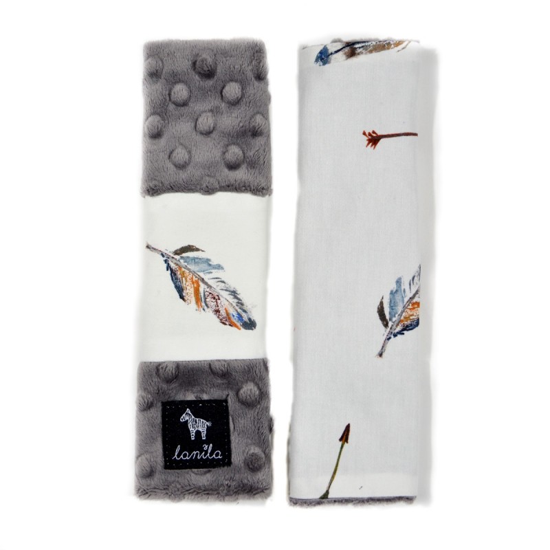 Ochraniacze do pasów Grey Pure zapinane są z pomocą mocnych rzepów – założenie ich na pas zajmuje zaledwie kilka chwil. Oryginalny nadrukw ręcznie malowane pióra będzie idealny dla każdego małego chłopca lub dziewczynki – piękne ochraniacze pozwolą przywyknąć przyszłemu kierowcy do bezpiecznego zapinania pasów. Ochraniacz na pas po zapięciu ma wymiary 8x22 cm i stabilnie utrzymuje się na miejscu. Miękki i puszysty polar Minky amortyzuje i izoluje ciało dziecka od sztywnych pasów, gwarantując wygodę nawet w czasie długich spacerów w wózku.