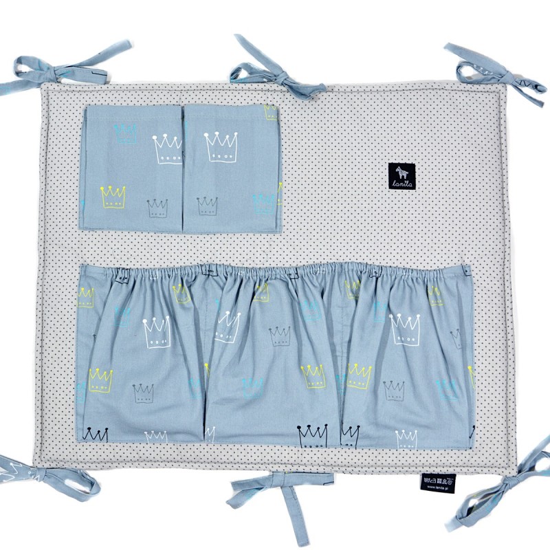 Organizery Lanila wykonane zostały z wysokogatunkowej bawełny z pięknym nadrukiem, który nie traci swojego koloru nawet po wielokrotnym praniu. W środku wypełnione zostały sprężystą gąbką, która usztywnia całość i sprawia, że przybornik nie traci swojego kształtu podczas użytkowania. W górnej oraz w dolnej części organizera znajdują się po 3 kokardy, którymi mocuje się całość do łóżeczka.