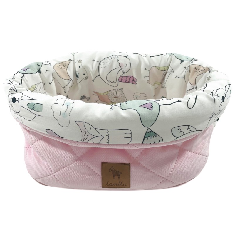 Pojemnik na akcesoria marki Lanila uszyty został z najwyższej jakości certyfikowanej bawełny oraz dzianiny Velvet. Środek to antyalergiczne, silikonowe wypełnienie, dzięki  czemu pojemnik może być umieszczony w pokoju, w którym śpi niemowlę. Idealny do przechowywania pieluszek, szczotek, ubranek czy produktów do codziennej pielęgnacji Maluszka. Świetnie pasuje jako praktyczny, a zarazem piękny dodatek do dziecięcego pokoju.