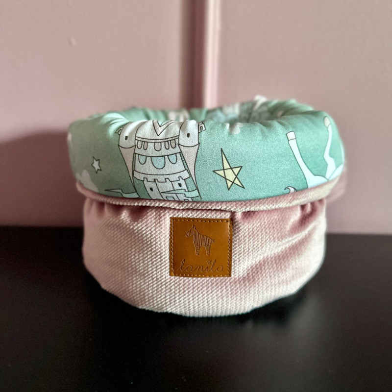 Pojemnik na akcesoria marki Lanila uszyty został z najwyższej jakości certyfikowanej bawełny oraz dzianiny Velvet. Środek to antyalergiczne, silikonowe wypełnienie, dzięki czemu pojemnik może być umieszczony w pokoju, w którym śpi niemowlę. Idealny do przechowywania pieluszek, szczotek, ubranek czy produktów do codziennej pielęgnacji Maluszka. Świetnie pasuje jako praktyczny, a zarazem piękny dodatek do dziecięcego pokoju.