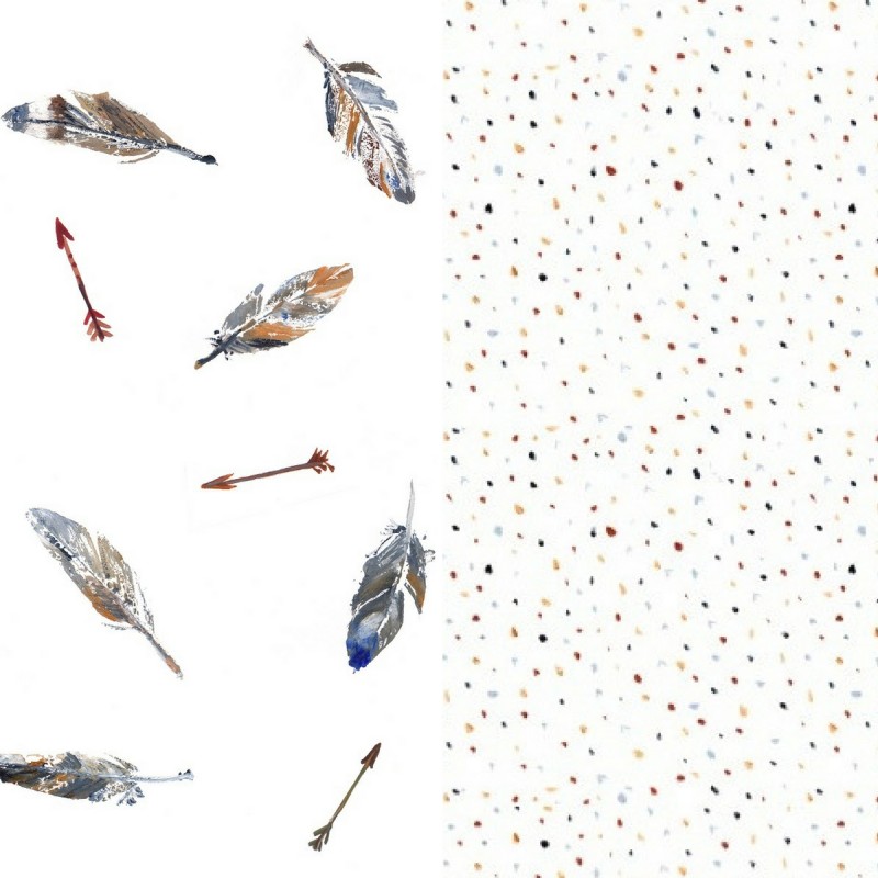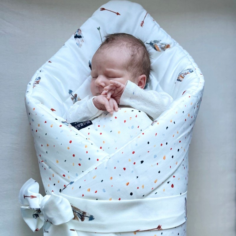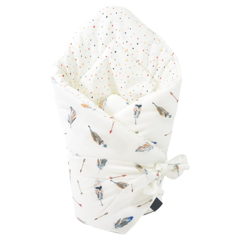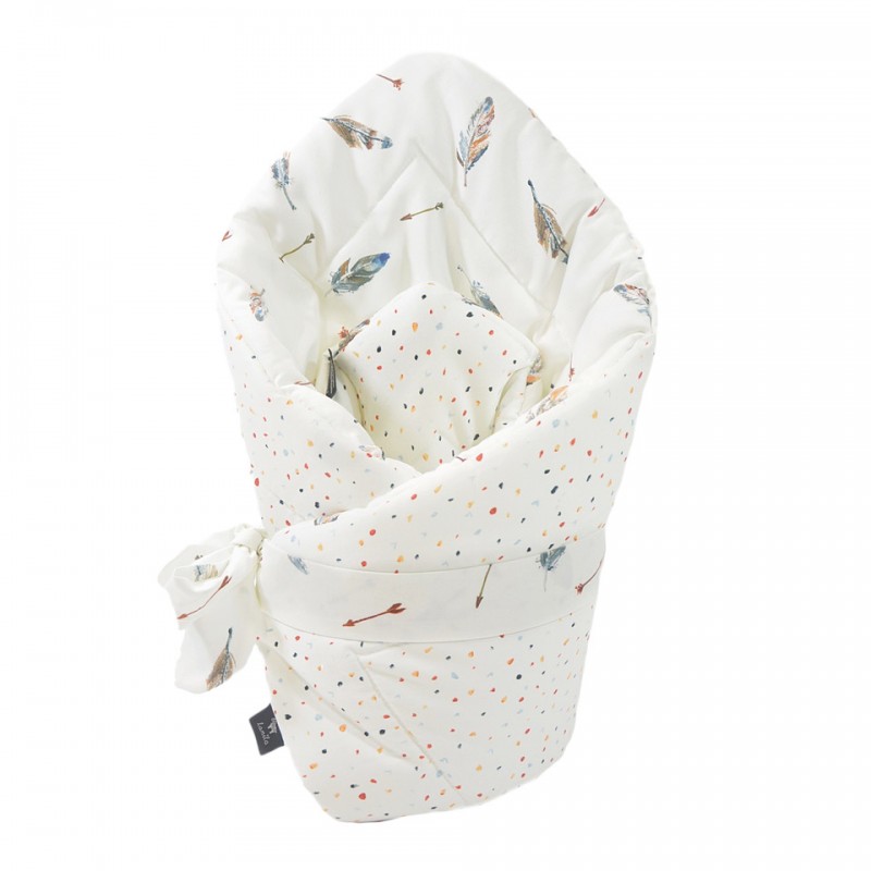 Rożek dla niemowlaka Pure/Dots z jednej strony wykonany został z miękkiej i delikatnej bawełny, zadrukowanej autorskim wzorem w piórka, z drugiej strony również z bawełny, tym razem w ręcznie malowane kropeczki.